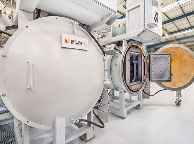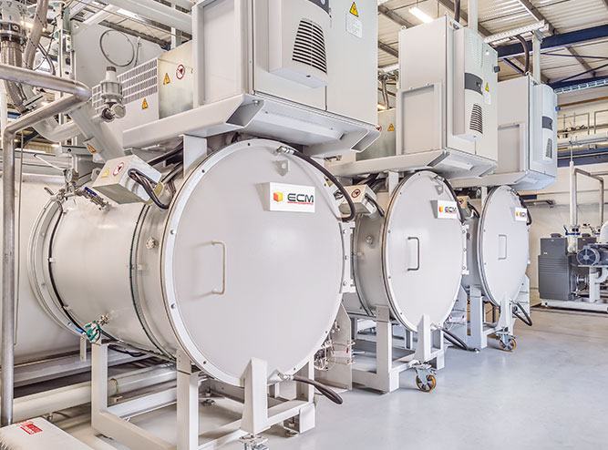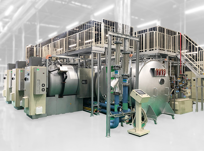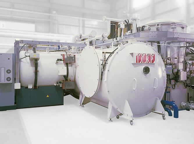 搬送室内に搬送ロボットが設置され、同一圧力で減圧制御された装置内をワークは、エアロックセル、加熱セル、油冷セル(ガス冷セル)とあらかじめ決められた処理条件のもと途切れることなく搬送され生産されます。加熱セルには、アセチレンガスがシミレーション・インフラカーブにより計算されたパルスにより噴射されます。加熱セルは、任意に停止・稼働が可能で、増産時には、加熱セルの増設が容易です。